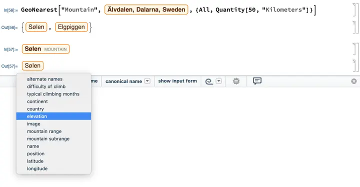 In the first line I use natural language to ask for Älvdalen, which returns an Entitiy. There are many different types of entities, like “AdministrativeDivision”, “Dinosaur”, “Glacier”, “Airport” or “ZipCode” and each has a unique set of meaningful properties, like Population for Cities. Wolfram comes with built-in knowledge, the same that powers WolframAlpha. Even the rather small “cities” around us are available.